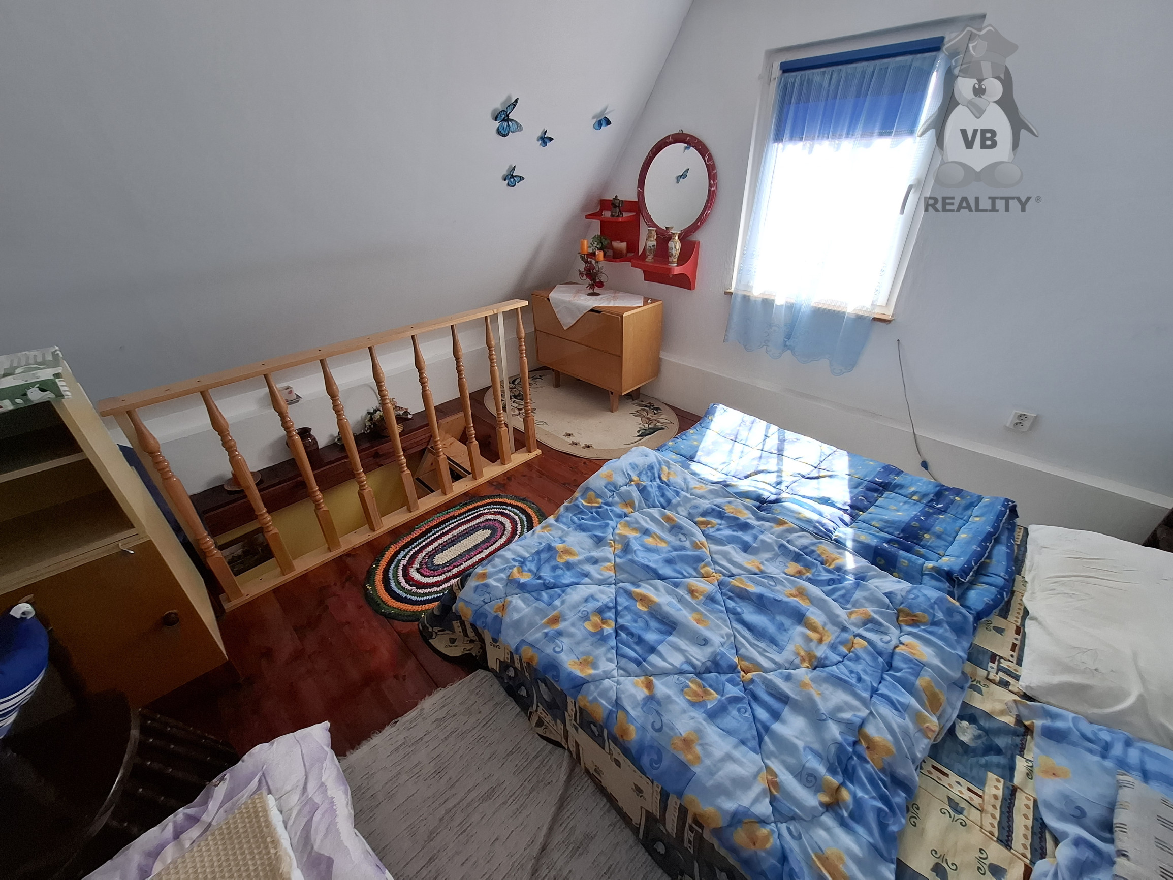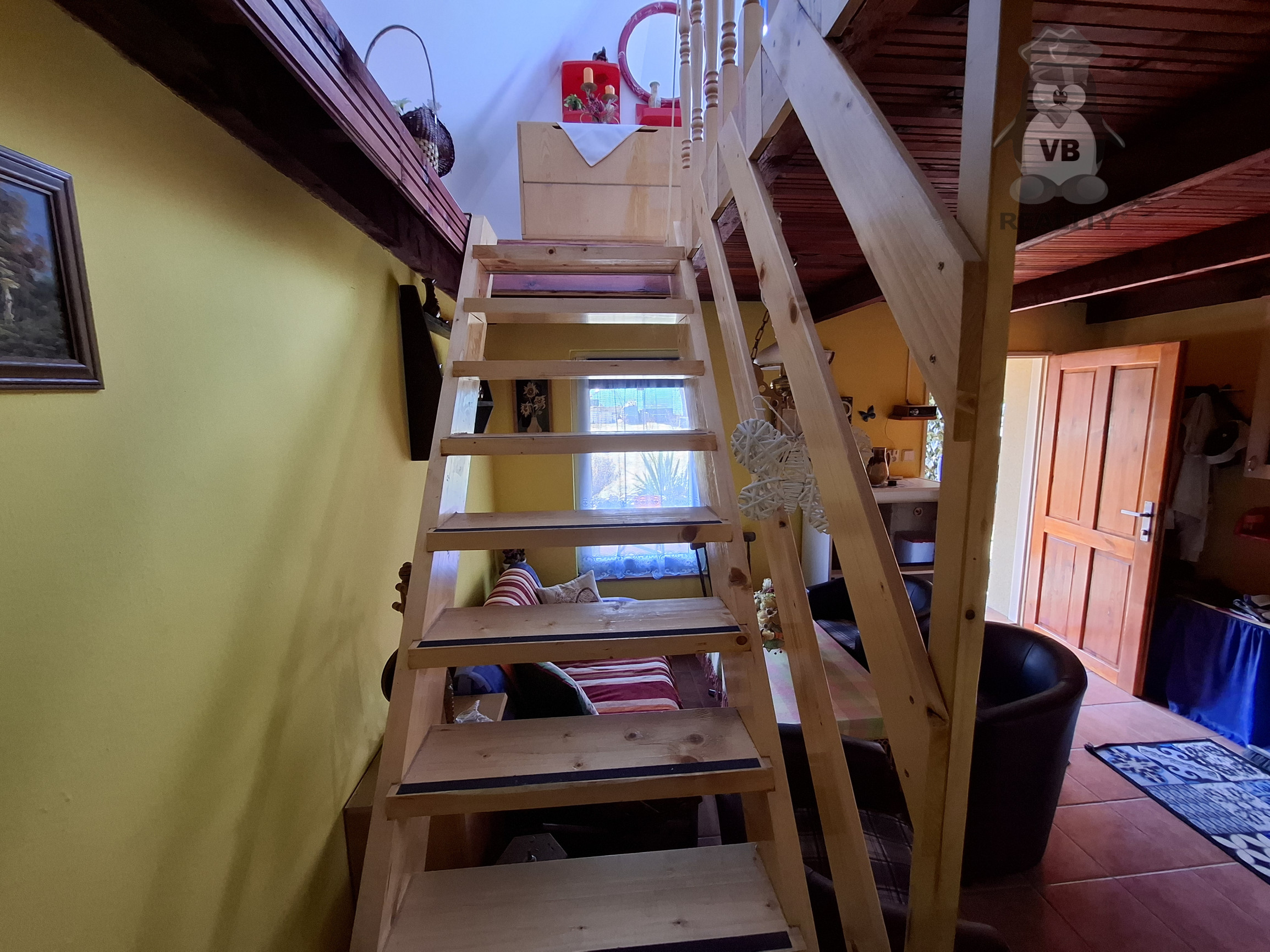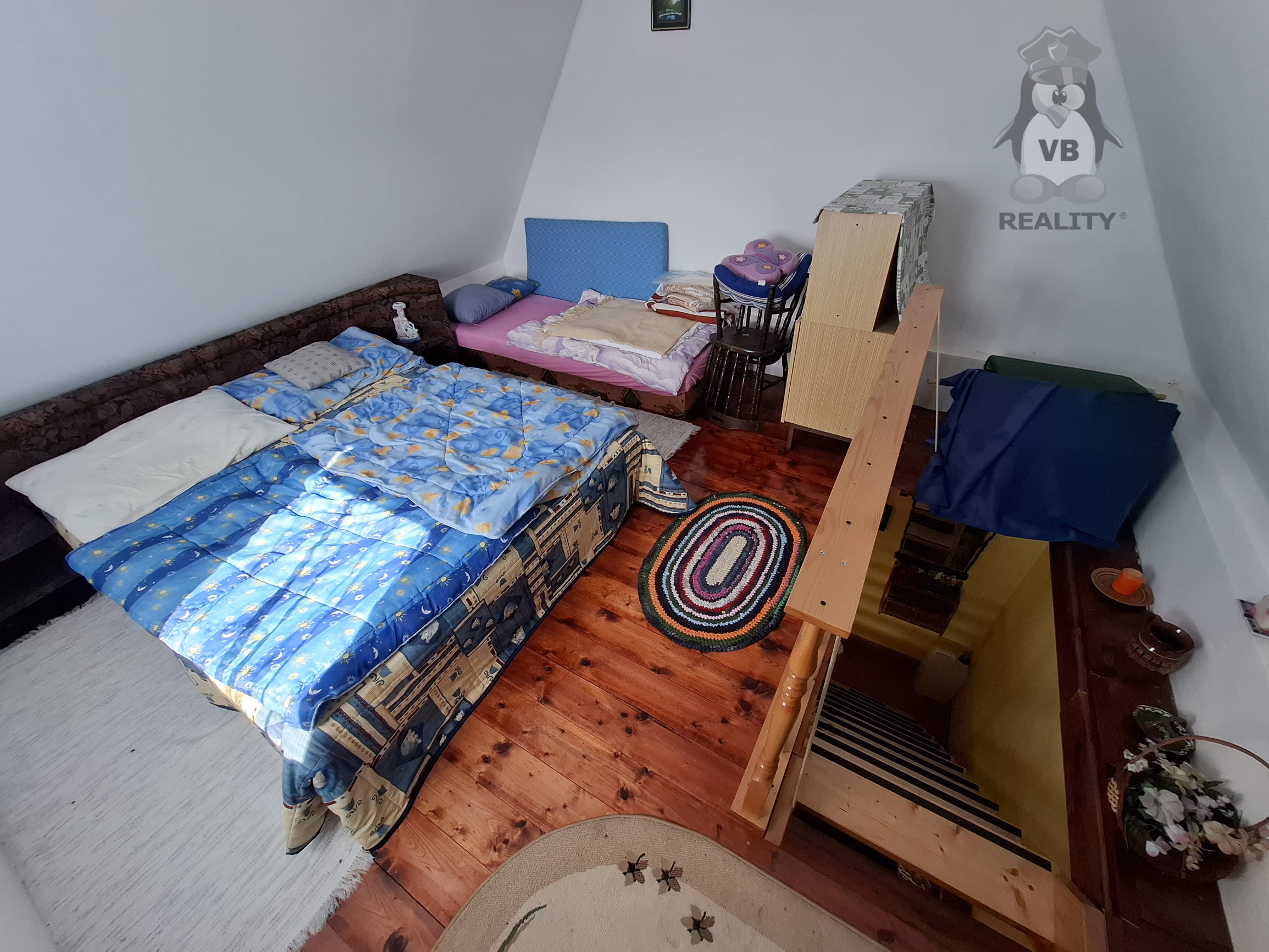 · na poschodí je obytný priestor s drevenou podlahou.